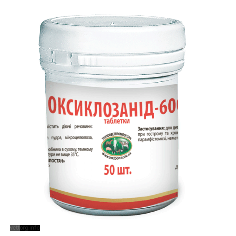 Препарат Оксіклозанід-600 таблетки володіє вираженим трематодоцидным дію, згубно діє на всі фази розвитку Moniezia, Fasciola spp., Paramphistomum spp. і Dicrocoelium lanceatum.