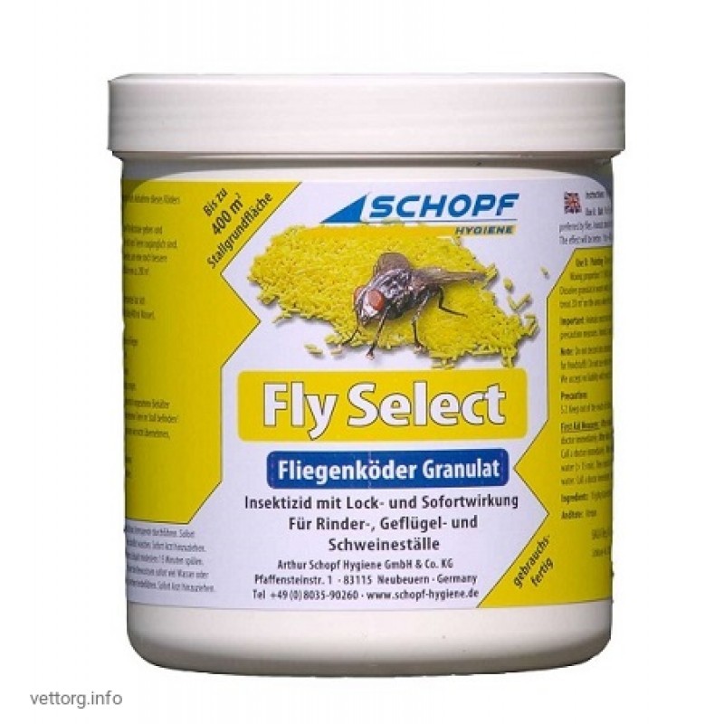 Флай селект фінал гранульована приманка жовтого кольору для знищення дорослих мух. Володіє високою привабливою активністю для мух за допомогою цукру і спеціального феромону (Z)-9-трикозену. Активний інгредієнт імідаклоприд, що належить до групи нео-никотиноїдів, впливає на центральну нервову систему комах і викликає порушення в передачі нервових імпульсів. Це веде до надійного і цілеспрямованого знищення мух. Флай селект фінал містить гірку речовину, яка запобігає випадковому проковтуванню нецільовими тваринами і дітьми.