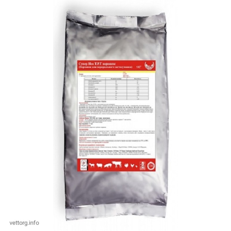 Супер Нео Т. Р. Т - це препарат який поєднує в собі антибіотики широкого спектру дії з полівітамінами, та гарантує швидку і надійну дію проти численних бактеріальних захворювань і харчових дефіцитів у свійської птиці та худоби. Широкий спектр активності проти різних грампозитивних і грамнегативних бактерій, спірохет, рикетсій і хламідій. Бактерицидна активність неоміцину в низькій концентрації щодо певних грампозитивних і грамнегативних кишкових патогенів. Антимікробна активність окситетрацикліна відбувається як у сироватці крові так і в шлунково-кишковому тракті, в той час як активність неоміцину концентрується лише в шлунково-кишковому тракті.