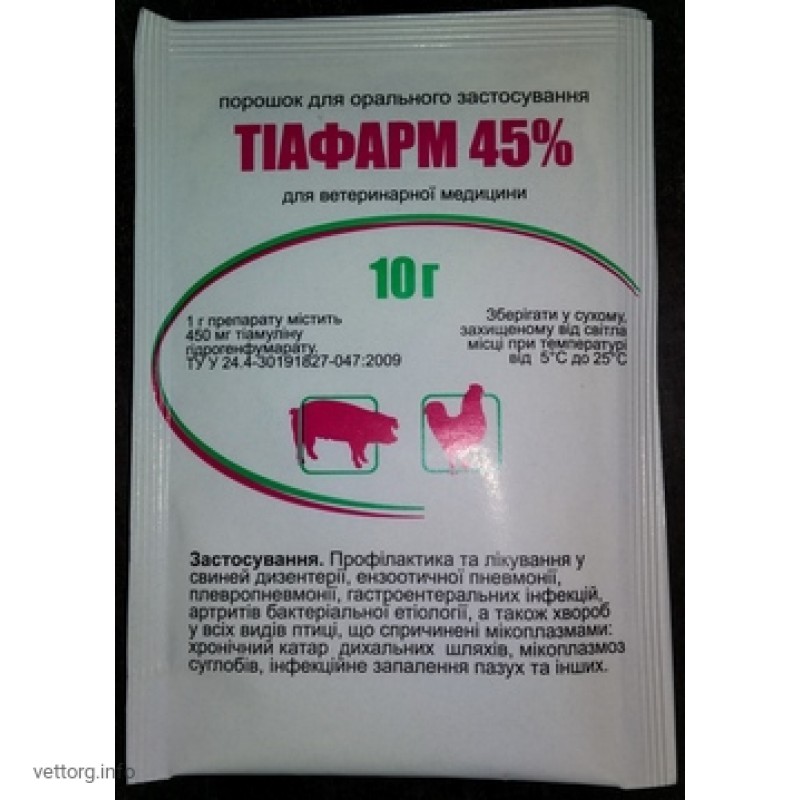 Не застосовувати одночасно з момензином, наразином та саліноміцином, перерва між застосуванням цих препаратів та “Тіафармом 45 %” повинна складати не менше 7 днів. Не застосовувати супоросним свиноматкам на першому місяці вагітності, племінним кнурам та курам-несучкам в період яйцекладки, тваринам з підвищеною чутливістю до тіамуліну.