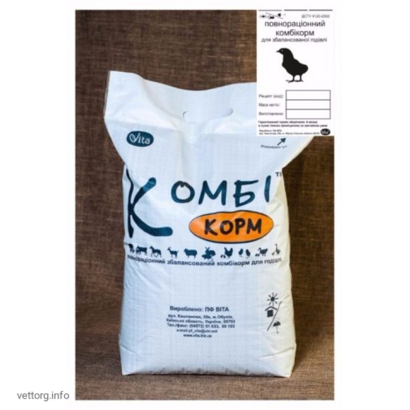 - Діючі речовини :кукурудза, пшениця, висівки, макуха соняшникова, шрот соєвий, ВМС (птиця) Сальцій Р (птиця), вапнякове борошно, олія соєва